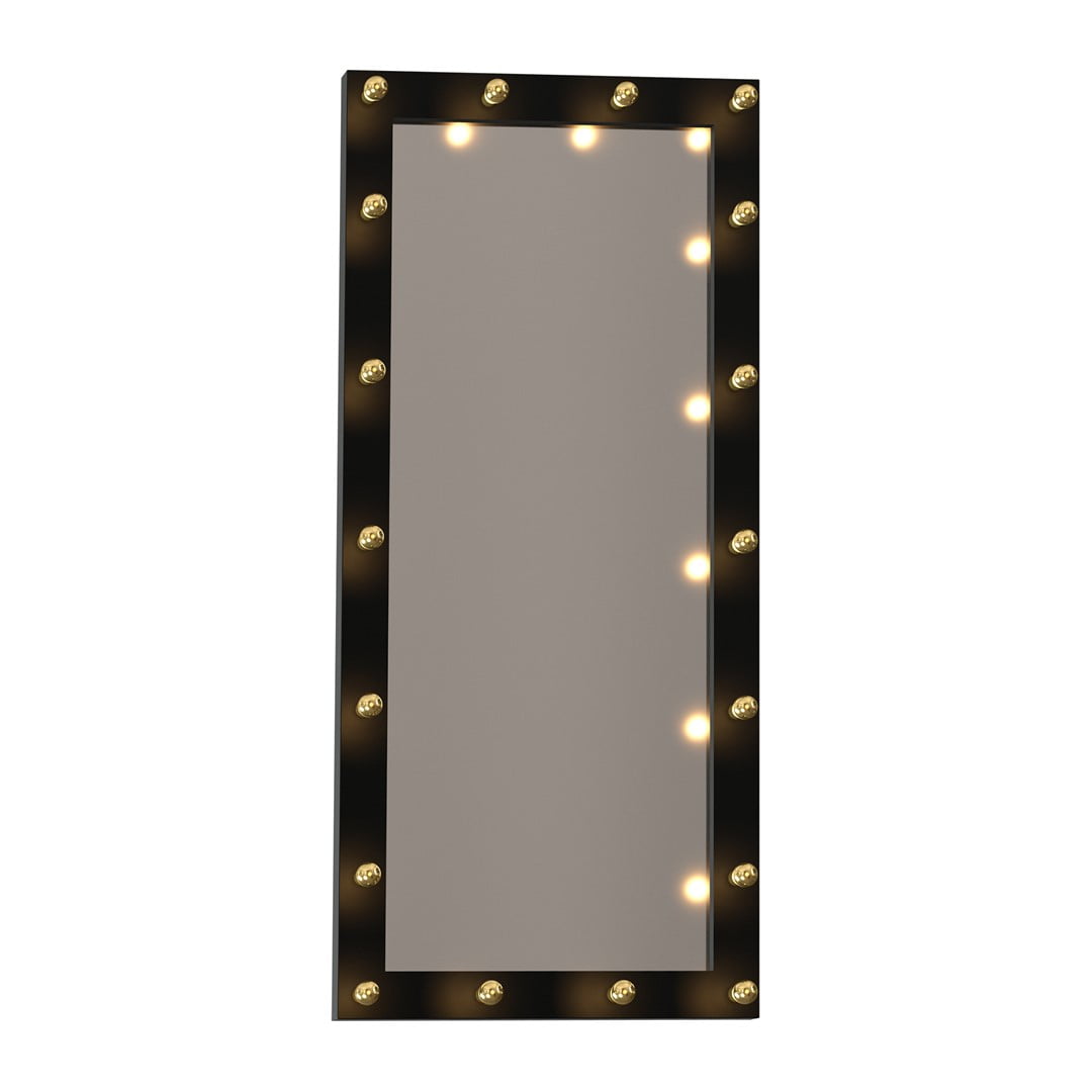 Poza 18 żarówkami umieszczonymi na prostokątnej, czarnej ramie ma również lustro.